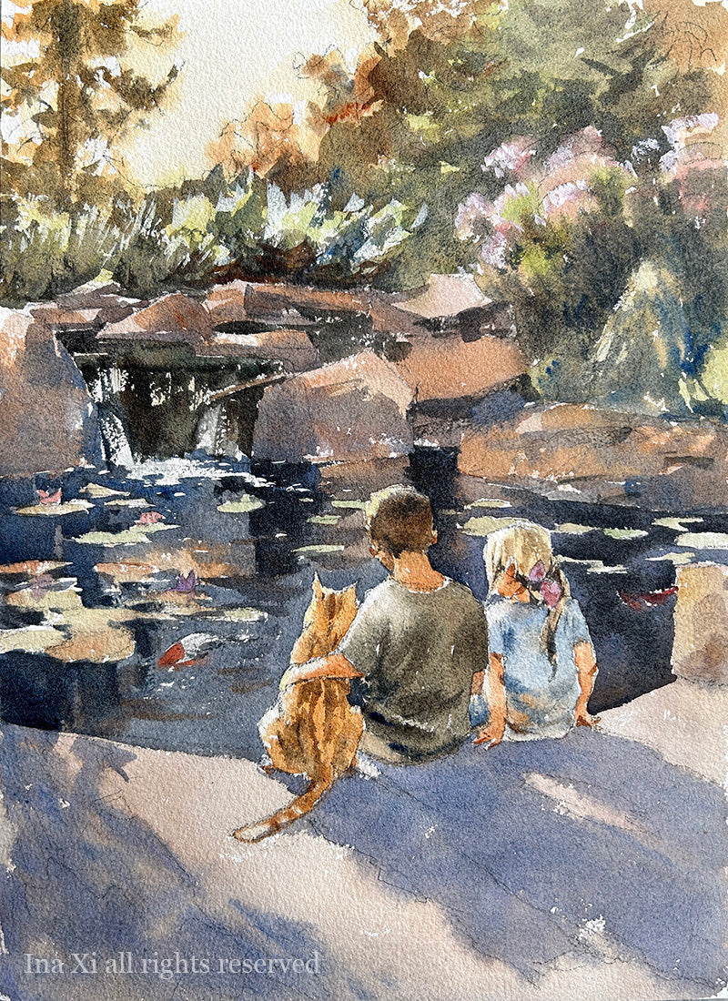 Dimensions shown for painting are the exact width and length of the paper, which are also the dimension of the painted area. I paint primarily on watercolor blocks, hence the common dimensions you see for most of my artworks. In cases where I taped the paper to the easel, I trimmed the white borders off in order to center the artwork and make it standard size, and therefore the dimension you see still applies to the dimension of the painted area as well as to the paper.