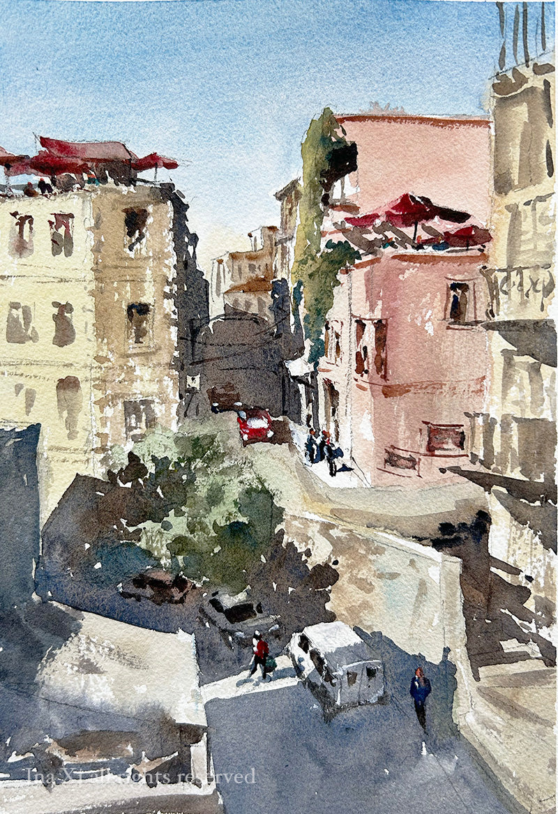 Istanbul is one of my fondest travel memories. Aside from its famous landmarks, the back streets of the old town Sultanahmet have its own allure: Built on hills, these narrow streets and old buildings created a multi-tiered, mezzanine-like formation; The juxtaposition of the tradition and the modern living can be observed from the city's many rooftop cafes. In this painting, I aimed to capture the vibe of the lunch break at an Istanbul street corner, with cars driving at all directions, and different characters going about their day, all woven together with these big shapes of light and dark amongst the buildings.